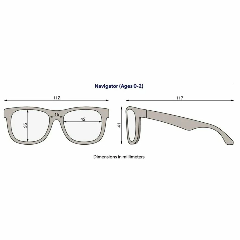 Junior Navigators sunglasses fit most babies 6 months to 2 years. Babiatorsยฎ are made of a soft material that is comfortable and lightweight. They are designed to fit kidsโ faces and donโt pinch the temples or nose. Fit will vary by child depending on head size. If youโre between sizes, we recommend ordering your childโs sunglasses a size up.