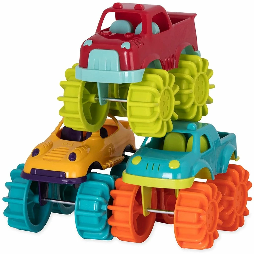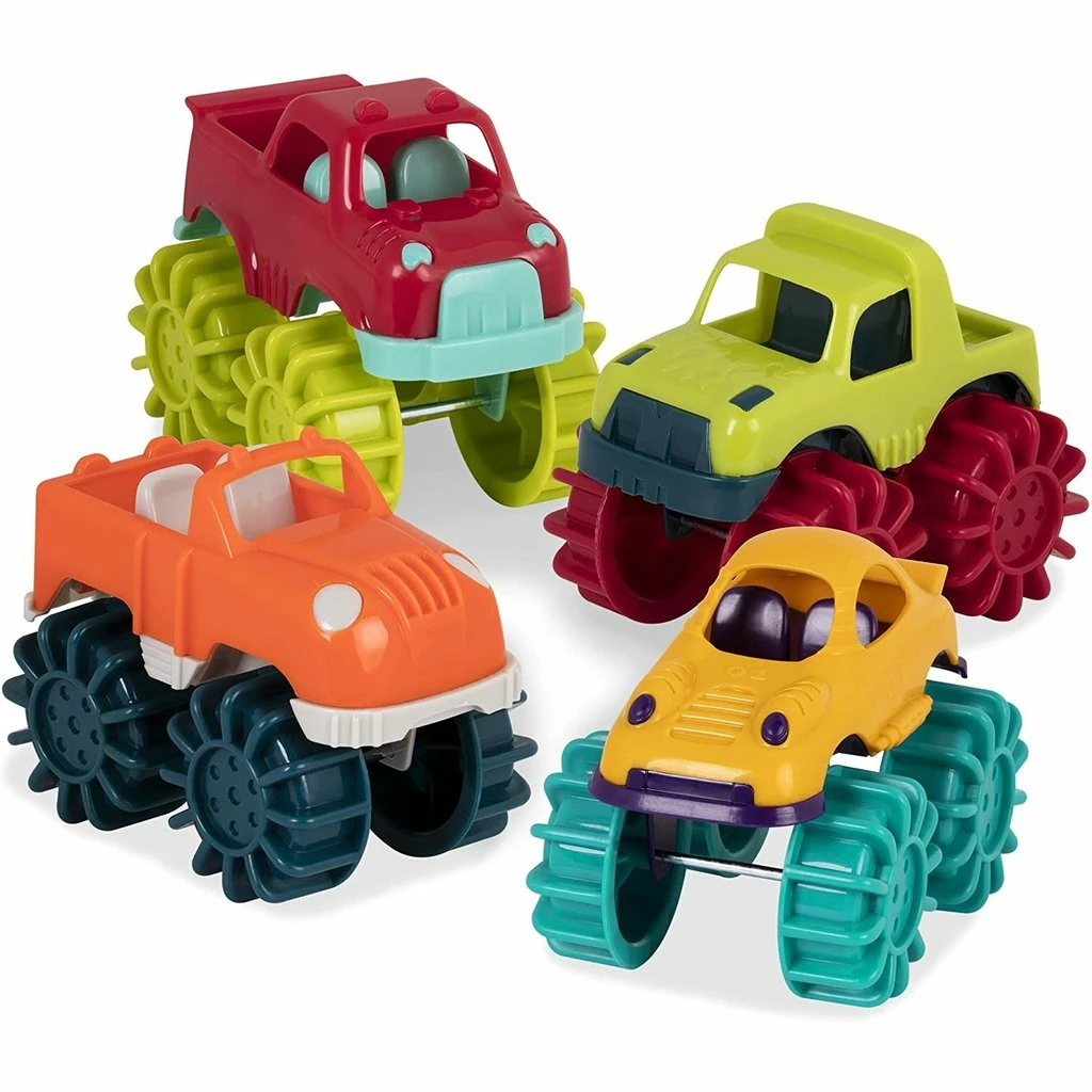 Heavy-duty fun for teeny tiny hands. Make play even more fun and build an obstacle course with the coffee table and a couple of pillows. Or dig a dirt road in the sandbox! Whether indoor or outdoor, just vroooooom in the fun with this set of 6 Mini Monster Trucks from Battat! There’s plenty for everybody, so share the fun! Perfect set for a playdate or even better, for birthday party favors. This toddler playset comes with 6 mini monster trucks that are easy-to-grab and drive around the playroom… or the sandbox. The textured wheels will create beautiful designs in the sand as you drive the mini truck around. This playset of 6 mini monster trucks comes in a convenient storage bag; perfect beach toys for your next trip. Made of safe and sturdy plastic, these toy trucks for toddlers, just like all the Battat toys meet or exceed the highest safety standards.