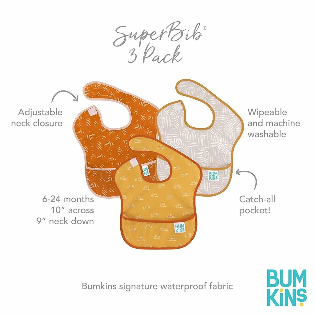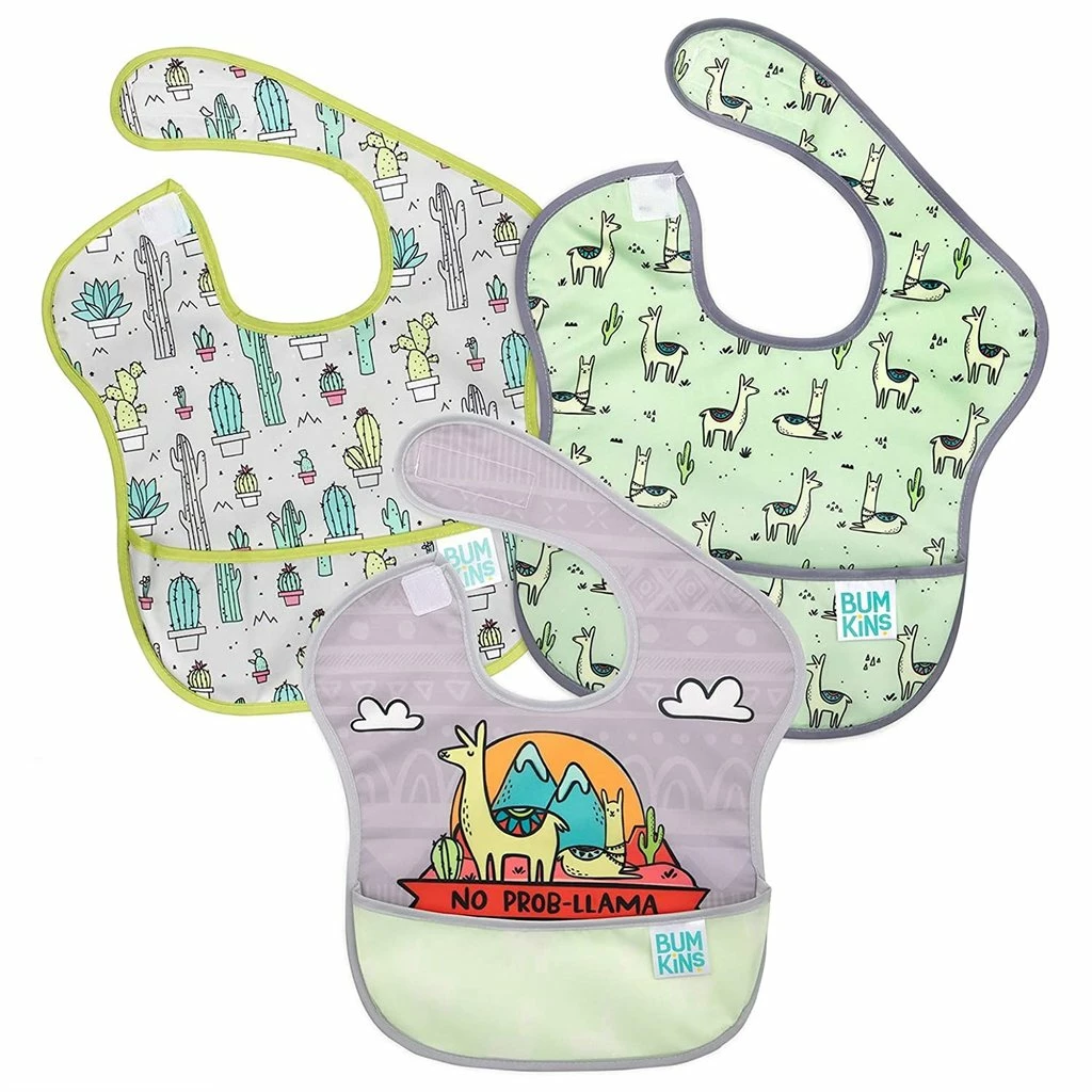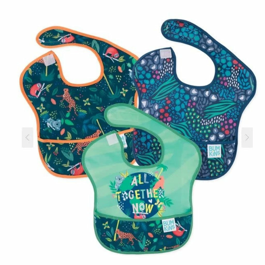 Our SuperBibs save you from the mess! The SuperBib attaches over the back of the shoulder with hook and loop closure for a quick, adjustable and tug-proof fit. With a handy crumb catcher / catch-all pocket for containing spills. Made from Bumkins lightweight, waterproof, easy-wipe, stain and odor resistant fabric. Single ply construction means no worrying about icky stuff growing between layers of fabric. Without a cotton layer, stains and smells don’t stick. Wipeable and machine washable for easy cleaning so you can use it over and over again. A pack of 3 ensures you have a clean one handy!
