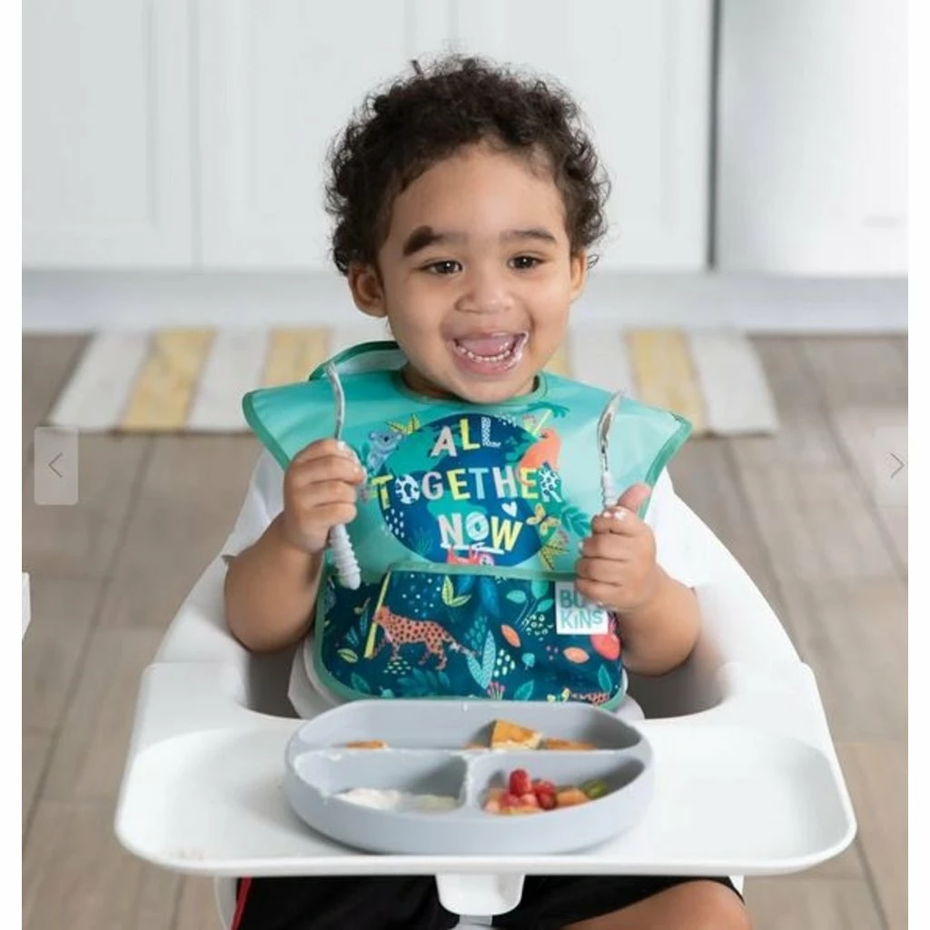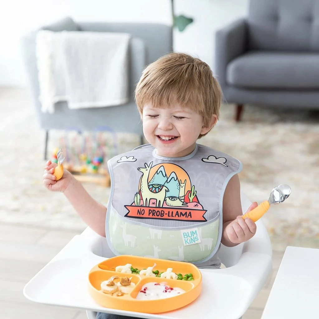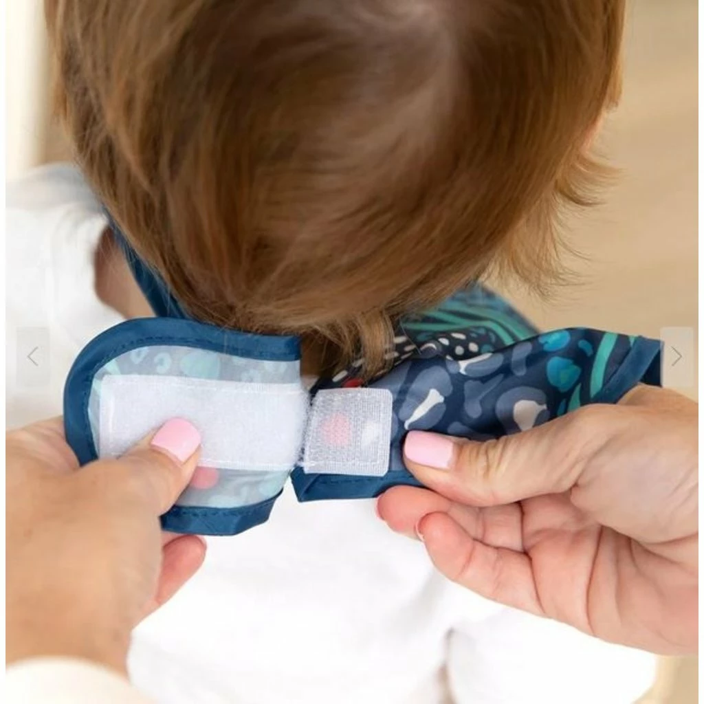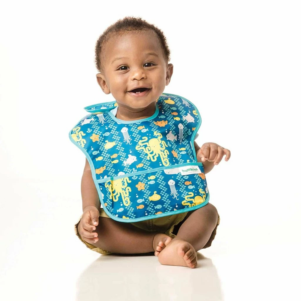 Our SuperBibs save you from the mess! The SuperBib attaches over the back of the shoulder with hook and loop closure for a quick, adjustable and tug-proof fit. With a handy crumb catcher / catch-all pocket for containing spills. Made from Bumkins lightweight, waterproof, easy-wipe, stain and odor resistant fabric. Single ply construction means no worrying about icky stuff growing between layers of fabric. Without a cotton layer, stains and smells don’t stick. Wipeable and machine washable for easy cleaning so you can use it over and over again. A pack of 3 ensures you have a clean one handy!
