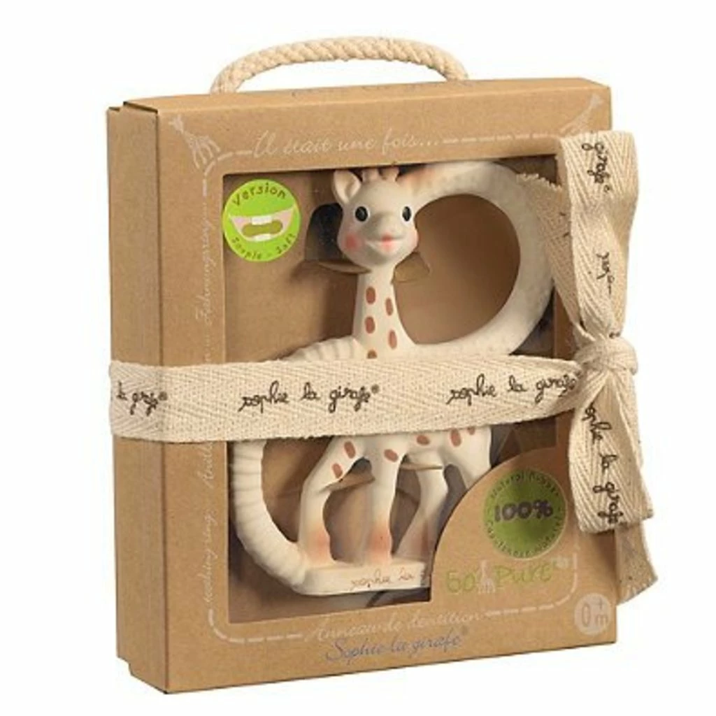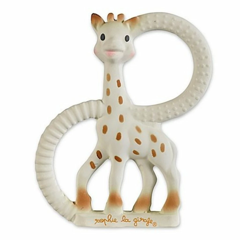 Born in France in 1961, Sophie the Giraffe has a long history of helping teething babies. Her So’pure® teether’s appealing vanilla lightly flavors a supersoft teether made of natural rubber with food-grade paint. The size and shape are just right for little hands to hold, while the variety of textures helps sooth painful gums.