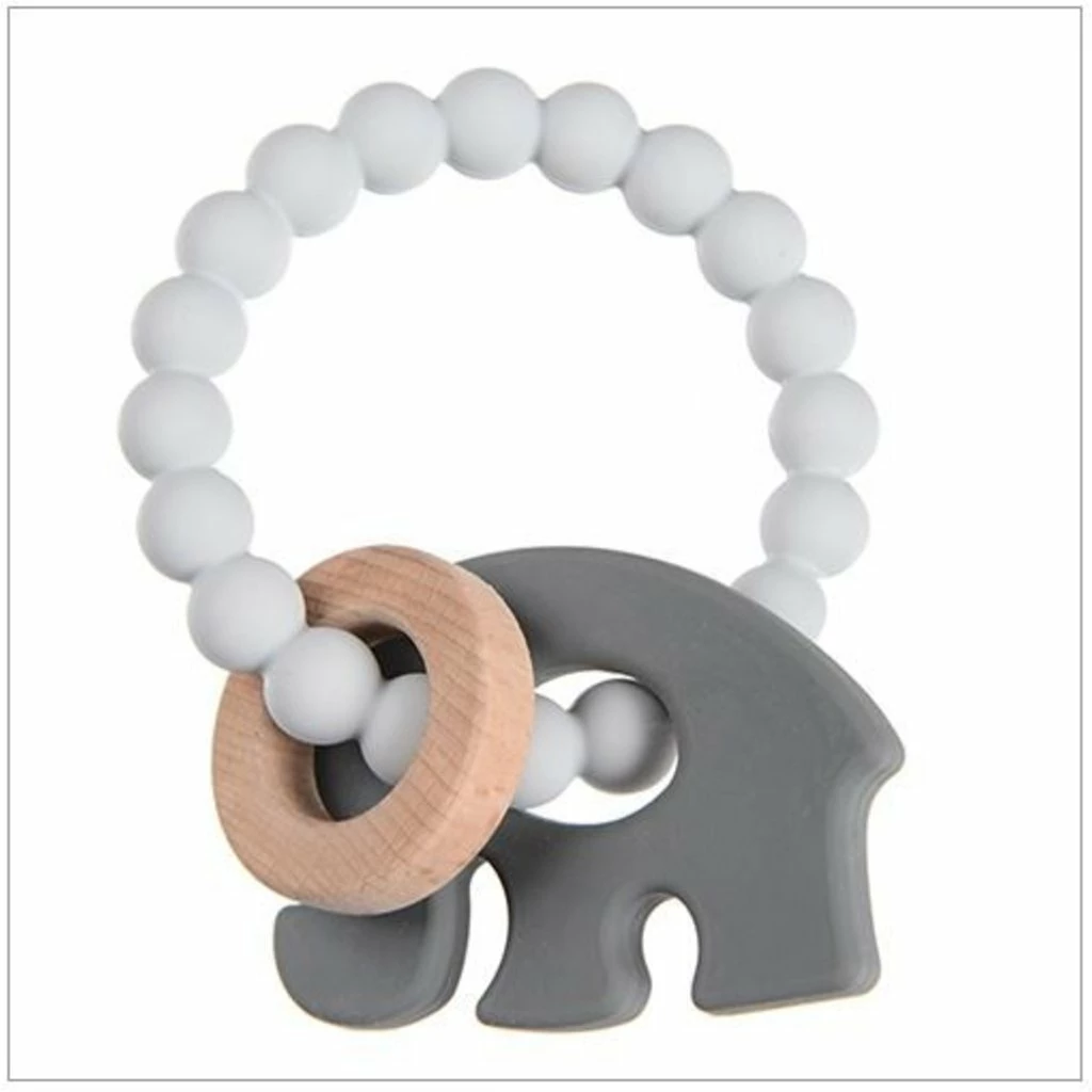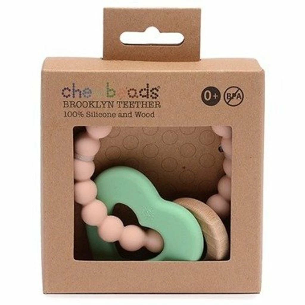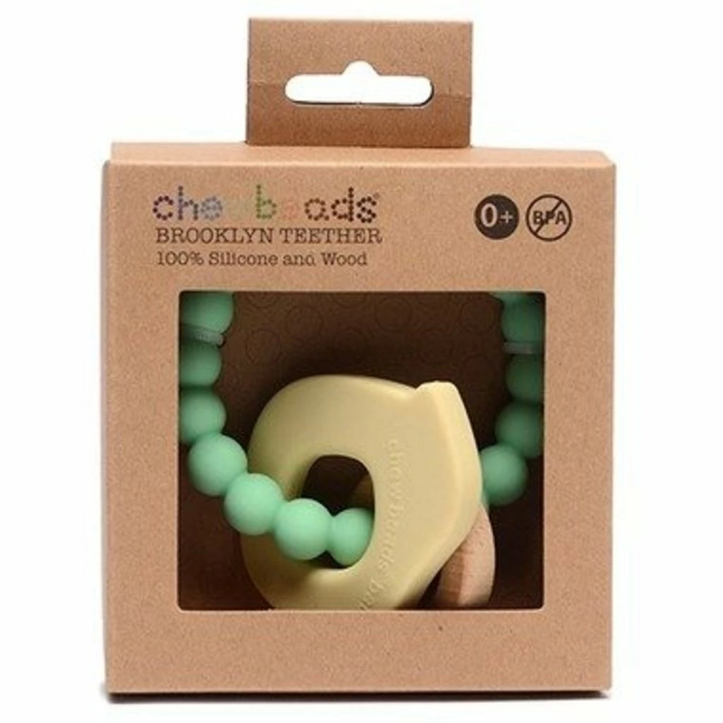- Chewbeadsยฎ Brooklyn Teether 100% silicone and wood teething ring is available in three colors (each sold separately):