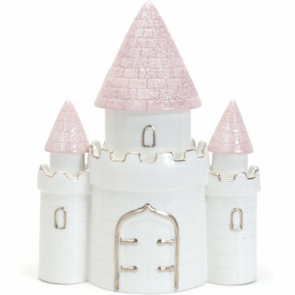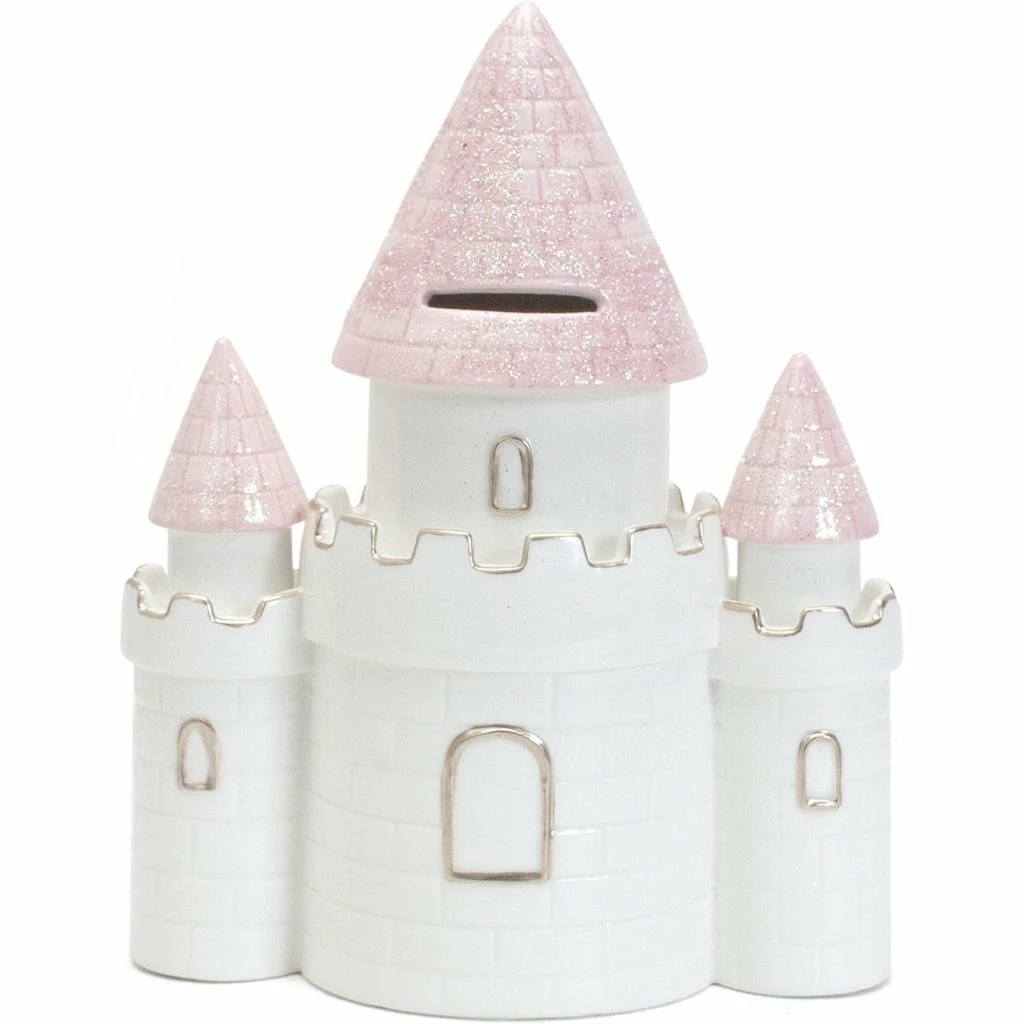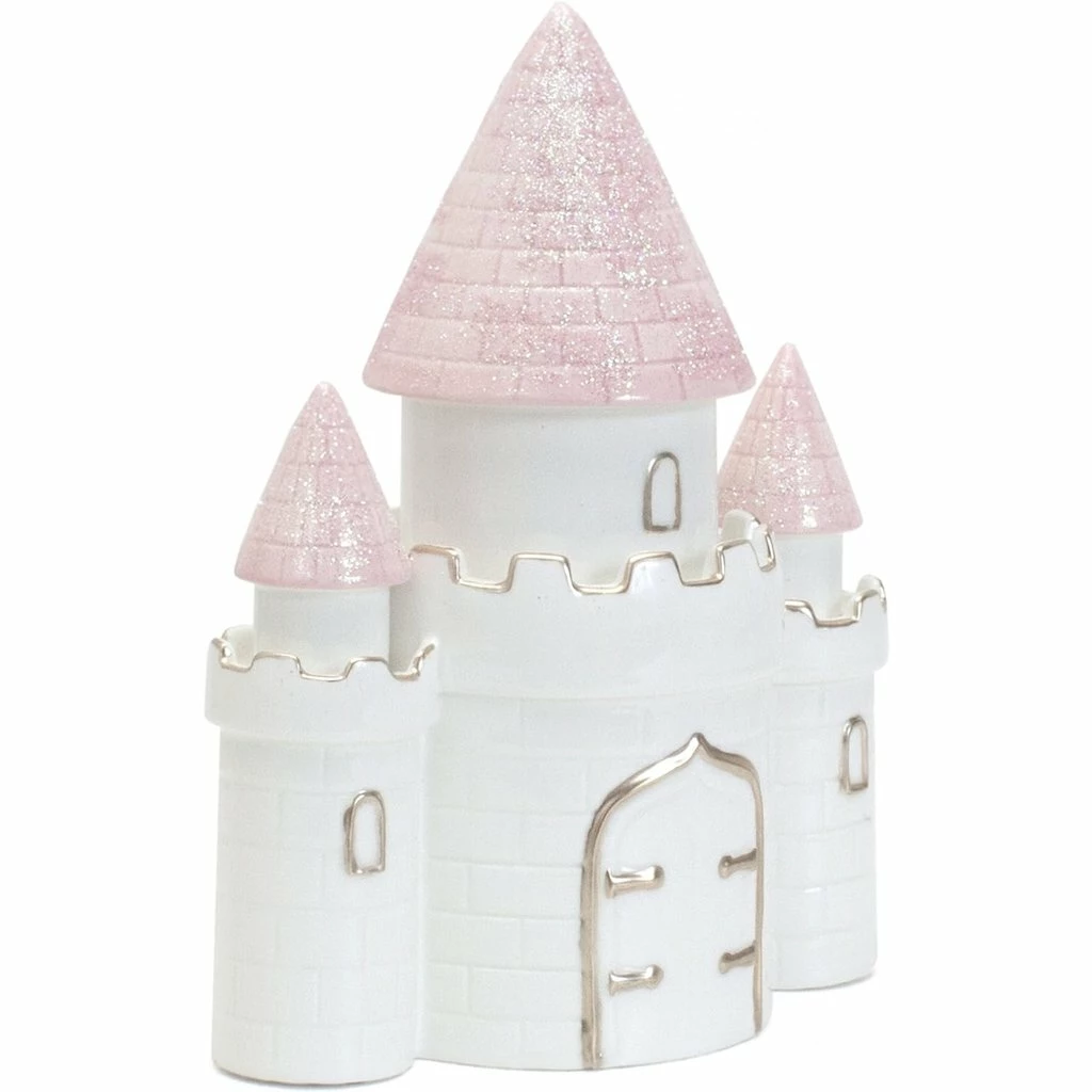 - Chloe’s Castle Bank is ivory with pink and gold details and measures 9 inches tall.