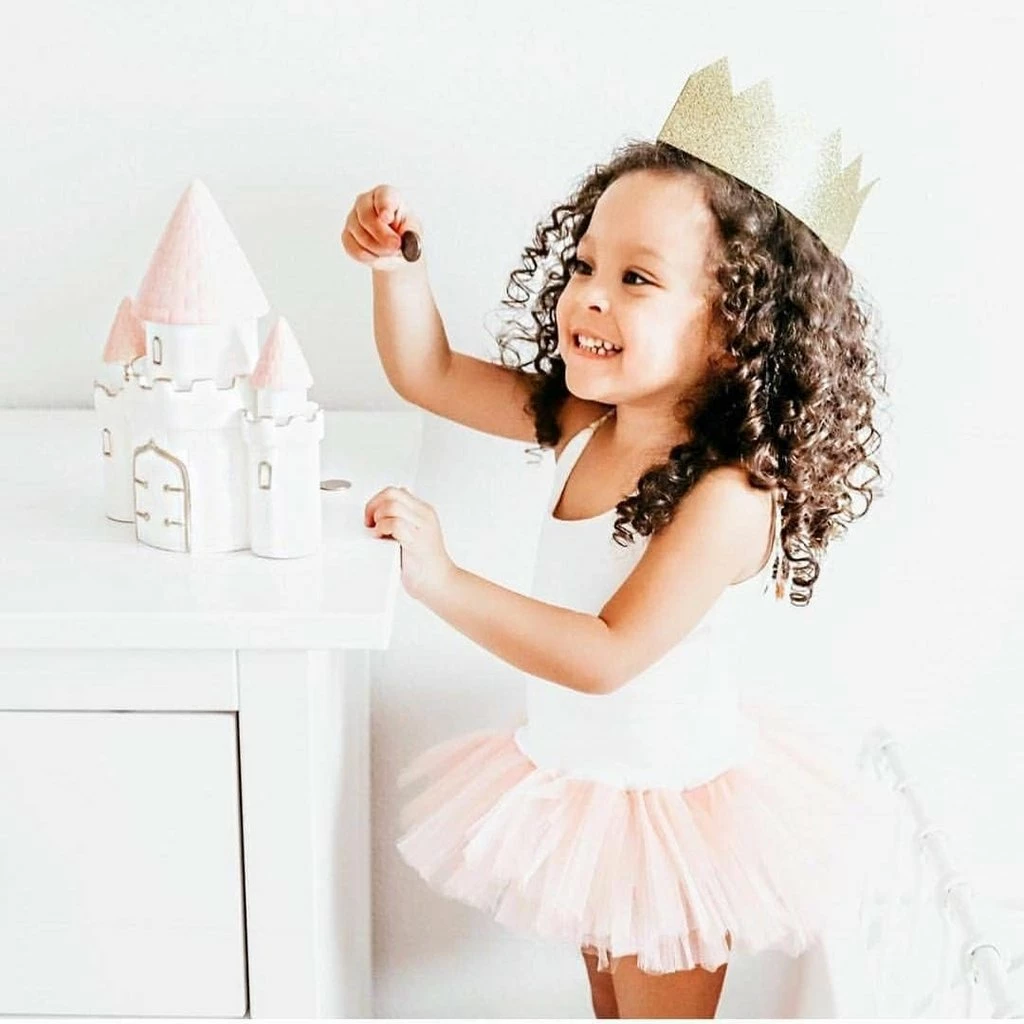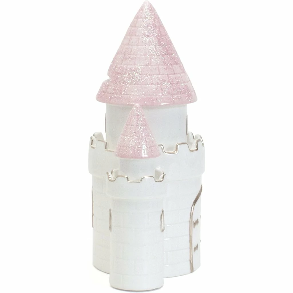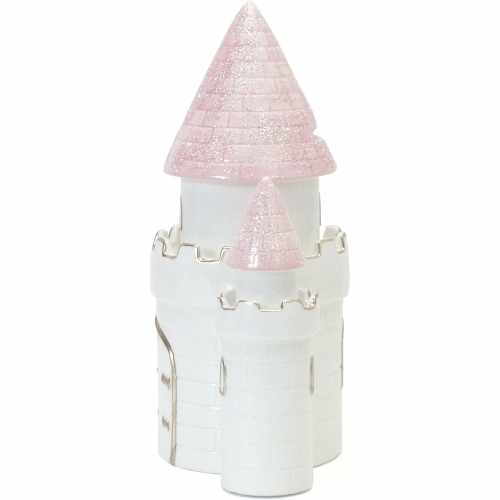 - Chloe’s Castle Bank is ivory with pink and gold details and measures 9 inches tall.