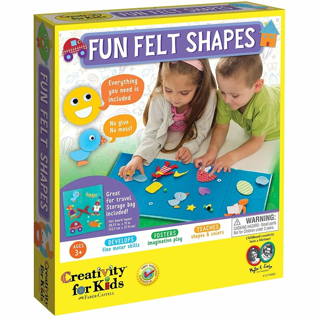 Perfect for preschoolers, My First Fun Felt Shapes is an open ended activity that will reinforce patterning and creative thinking. Creativity For Kids is known for their creative products that help develop fine motor skills, foster imaginative play and teach shapes and colors. No mess and great for travel, this felt board includes a neat and tidy storage bag.Β