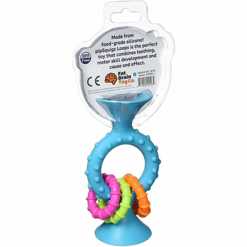 Their vivid textures of Pipsquigz Loops® instantly inspire little fingers to grab and feel while their soft silicone material simultaneously makes them perfect for soothing sore gums. Flip and spin the textured, plastic rings to hear them rattle brightly! Press their suction cups onto any smooth, non-porous surface to set up a stationary play space and then pull them off to hear their loud and exciting POP!
