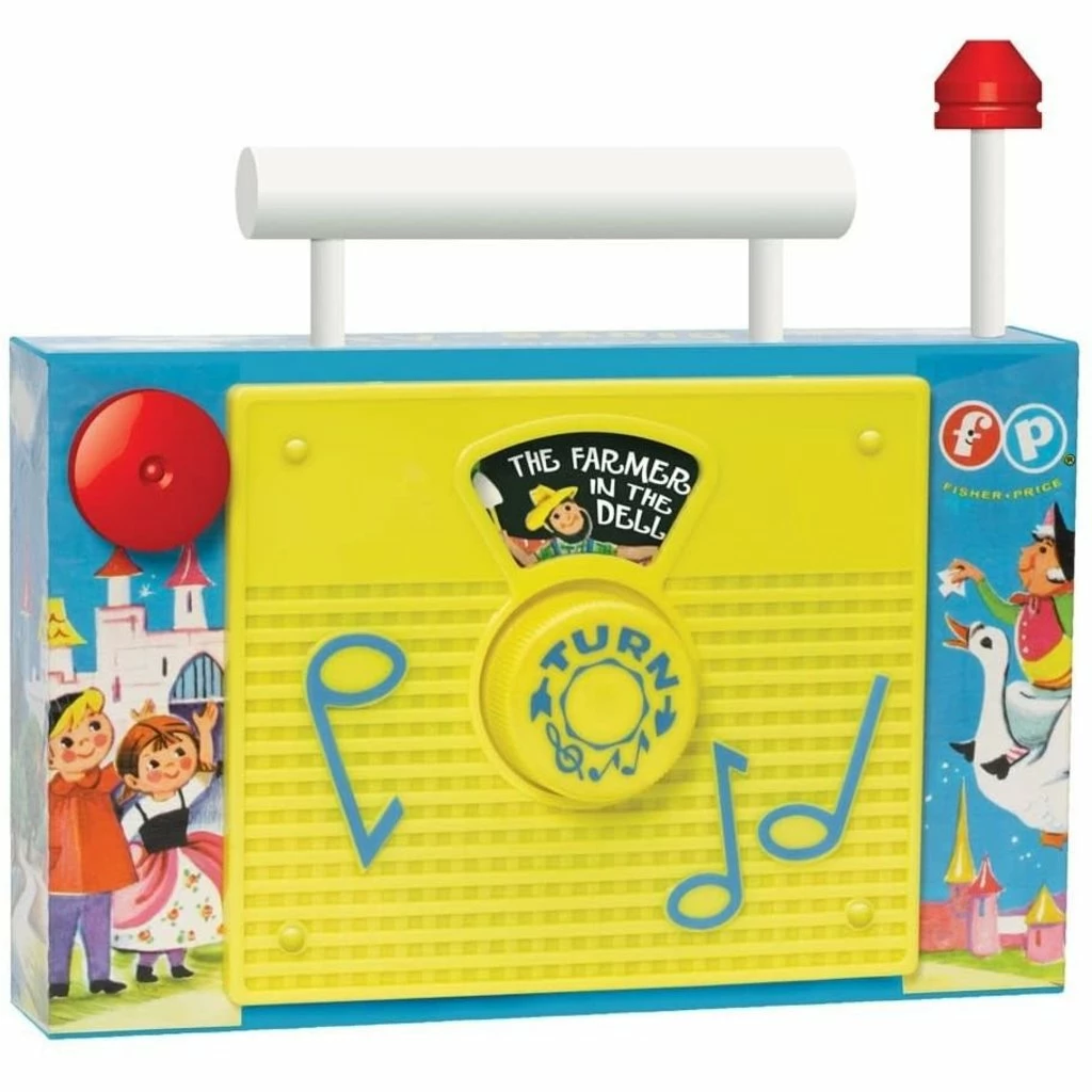 First introduced in 1959, the Fisher Price TV Radio has delighted children for generations! Wind the knob to hear the endearing Farmer-in-the-Dell melody while whimsical scenes scroll across the window of the brightly lithographed case.Β Since 1930, Fisher-Price has been in business to create toys that fascinate and stimulate a child’s imagination.