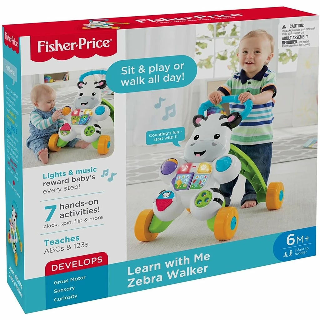 From teaching first words to encouraging first steps, the Fisher-Price® Learn with Me Zebra Walker is the kind of first friend you want for your little one! Spin, flip, roll, click, twist. This zebra’s full of busy, hands-on activities for sitting babies. Your tot can turn the book page or press the light-up buttons to learn all about ABC’s & 123’s through sing-along songs and phrases with new animal friends!