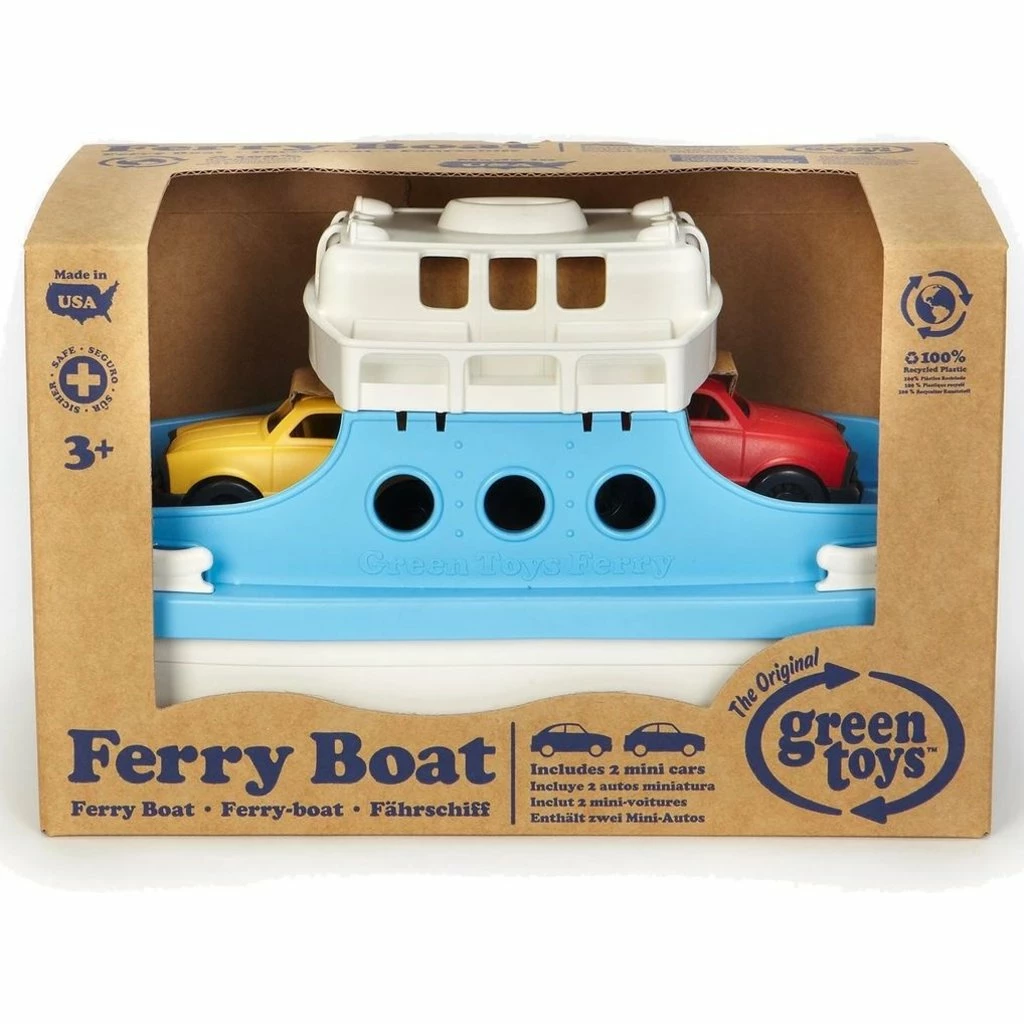 Set sail with the Green Toys Ferry Boat for a quick bathtub excursion or an extended trans-pool voyage. Whatever the adventure, this two-story vessel is ready to hit the open water with room for eco-friendly cargo galore, and even comes with two Green Toys Mini Fastback cars. Use the slide-out ramp to load up the spacious bottom level that accommodates up to four Green Toys cars. The open top deck features two small benches on each side, as well as eleven windows looking down into the main level. Made in the USA from 100% recycled plastic milk jugs that save energy and reduce greenhouse gas emissions, this craft is ideal for any body of water – durable, buoyant, and dishwasher safe. The hull also detaches for easy cleaning.
