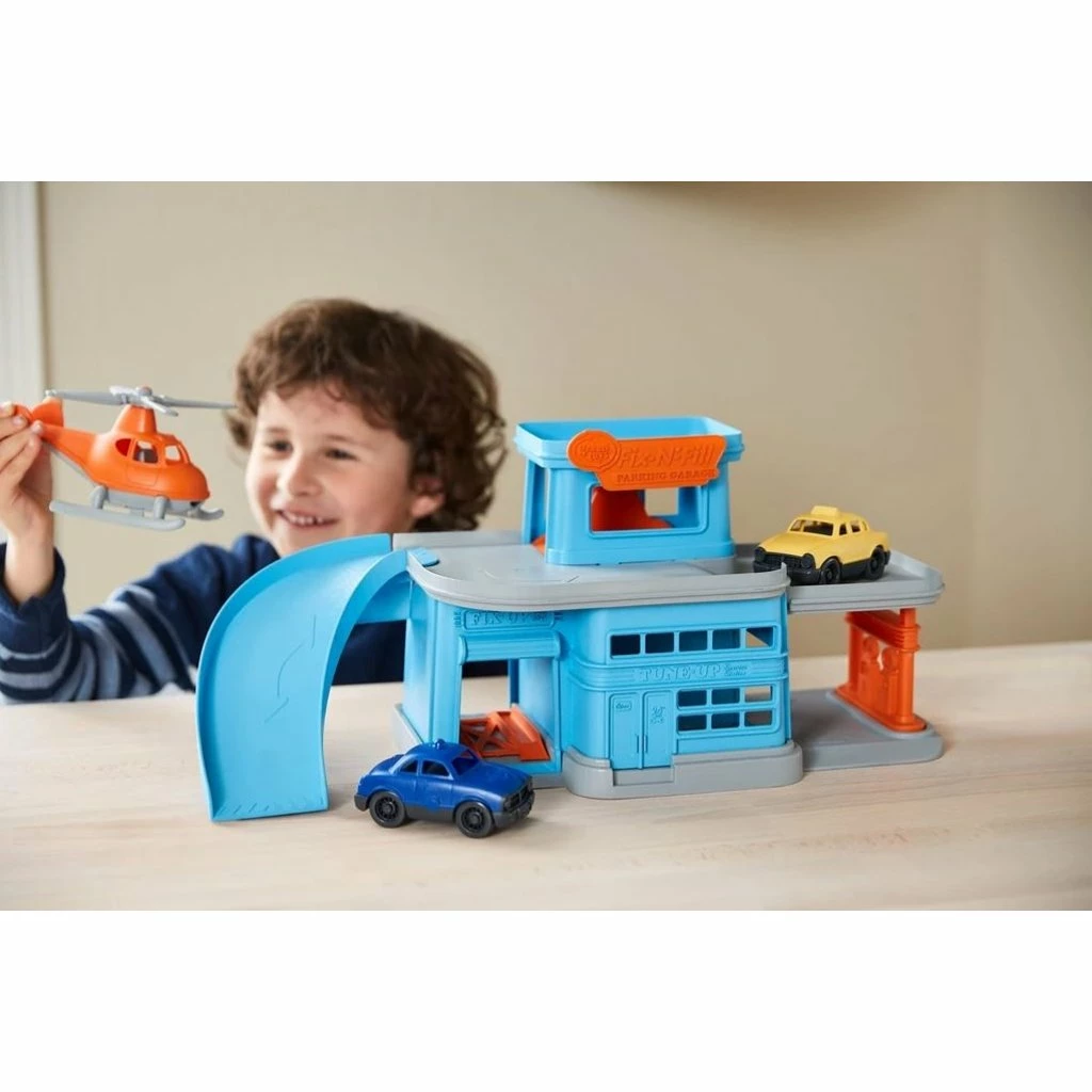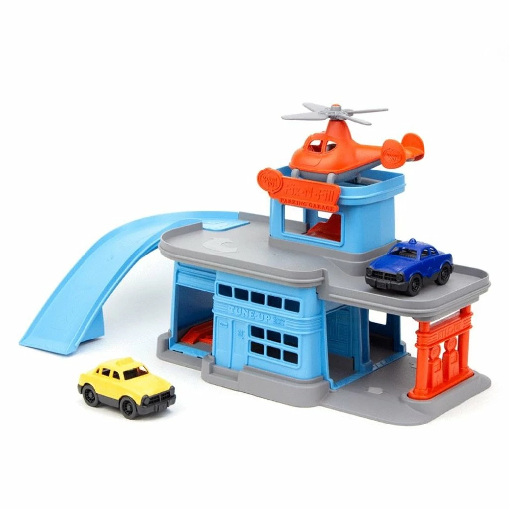 Drive up, fill up, fix up, and take off! The Green Toysβ’ Recycled Parking Garage is a multi-level play space that encourages motor skill development, cause and effect reasoning, and imaginative, narrative play. Made in the USA from 100% recycled plastic milk jugs, the set includes a Mini Helicopter and two Mini Vehicles, and is scaled to work with the best-selling Green Toys Ferry Boat and Car Carrier. Featuring a drive-through service station on one end and a ramp on the other, an elevator in back and helipad on top, this full-service, 360Β° set is ready for play from any angle. Plus, the helicopter can clip onto the cars to fly them around!