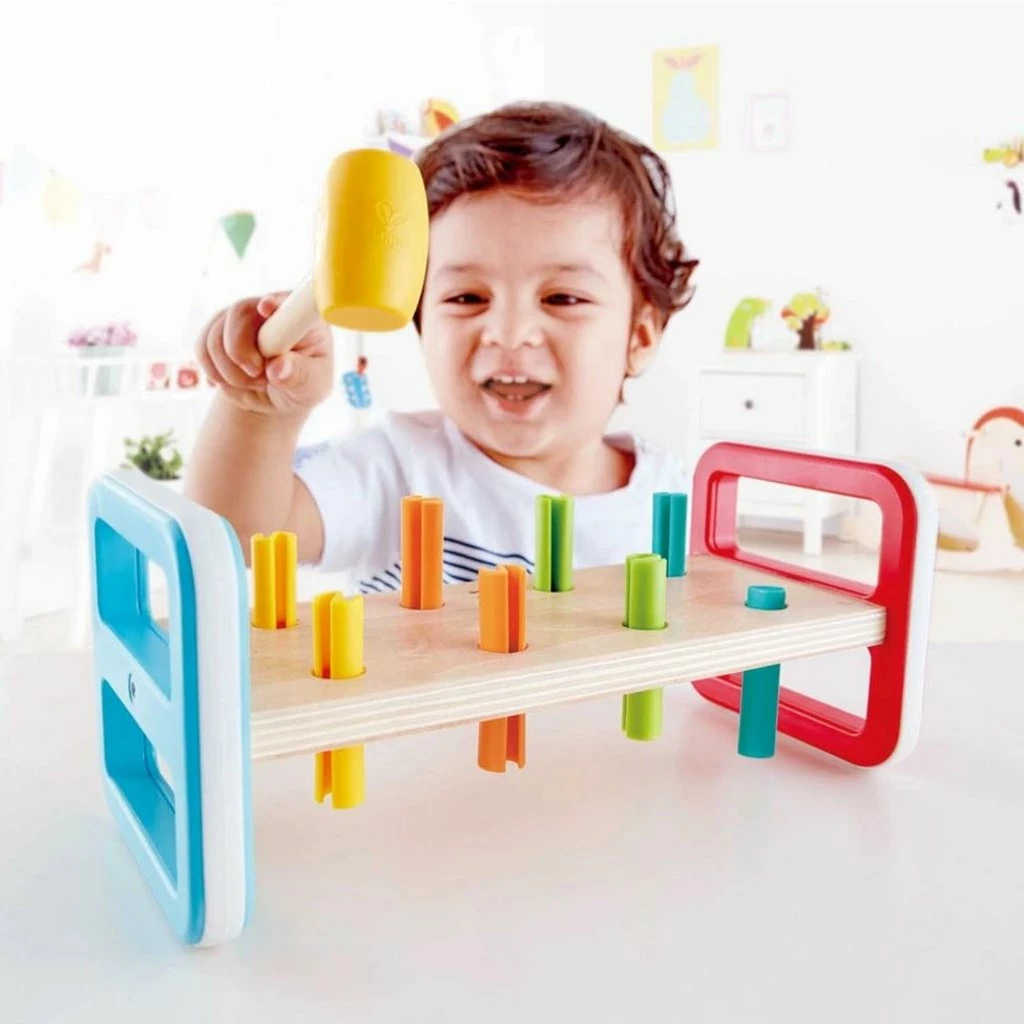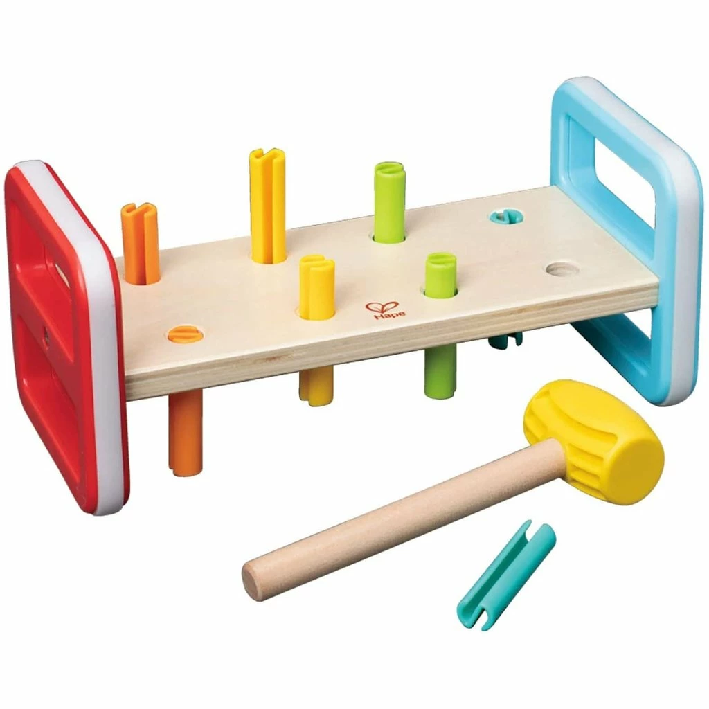 - Includes: bench, eight pegs in four different colors, and a wooden hammer with a soft plastic head