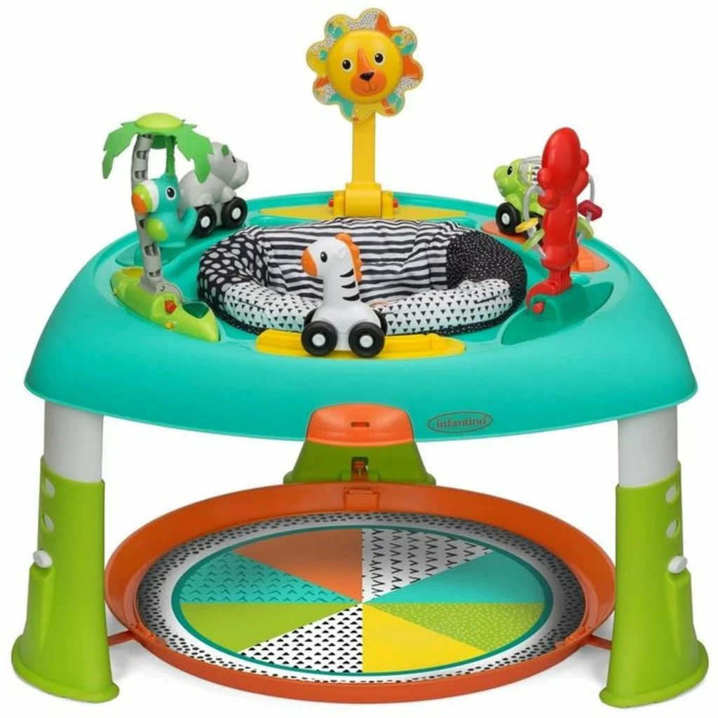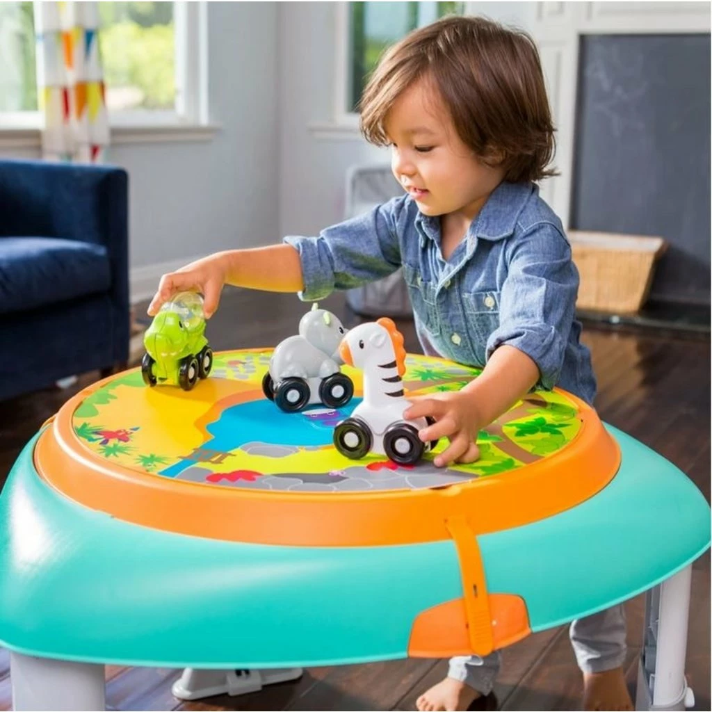 This transforming entertainer keeps little ones busy from tiny to toddlerโข. Little ones can spin 360 degrees while exploring 6 engaging interactive toys, including light-up buttons that activate music and sound effects. Features three height settings for growing tots. Once little one is walking, transform the entertainer into a stand-and-play activity table with three rolling animal pals. When playtime is done, the toys fold in and the legs fold under the table in seconds. Easy to store, take to grandma’s house, or simply move from room to room.