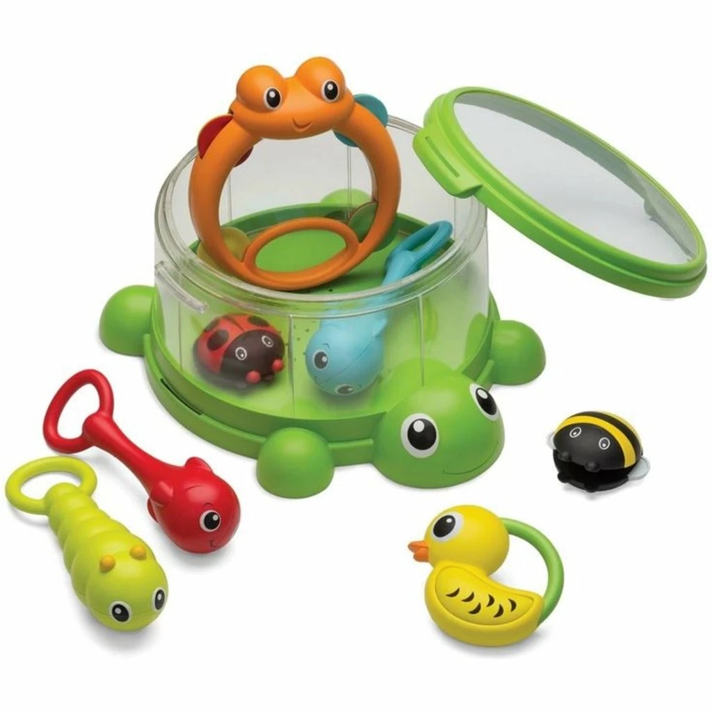This Turtle Band Percussion Set includes a turtle drum, two fish drum sticks, caterpillar maraca, frog tambourine, jingle bell duck, and lady bug and bumble bee castanets. Perfect for silly solos and family jam sessions. When play time is done, the instruments store neatly inside the turtle drum.