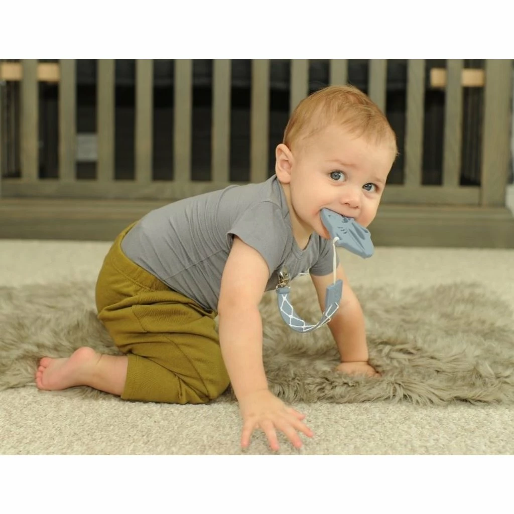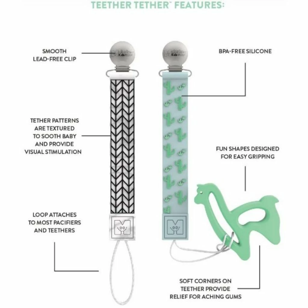 - Textured, flexible, BPA-free, food-grade silicone Teether Tether™ & Teether are safe for baby to chew.