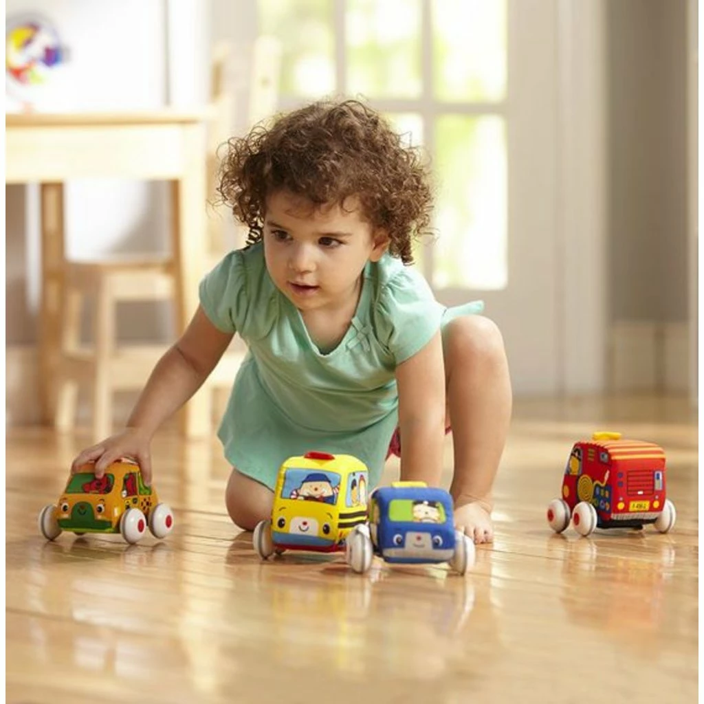 - Soft pull-and-go vehicle set is brilliantly colored and designed for babies and toddlers.