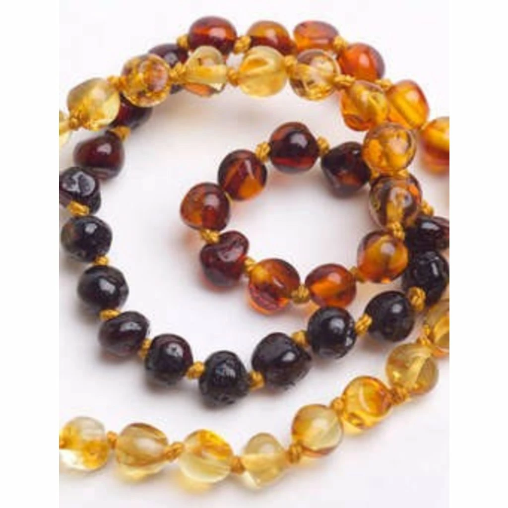 Momma Goose Baltic Amber Teething Necklacesβ’, made with beads of true Baltic Amber, are a natural form of pain relief for teething babies. Amber is a fossilized tree resin and contains succinic acid, which when worn against the skin, provides anti-inflammatory and analgesic effects. For a teething baby, this means pain relief and a reduction in the inflammation of the gums associated with teething. Generally, wearing amber closest to the site of pain or inflammation provides the greatest benefit. For teething babies, that means the neck.