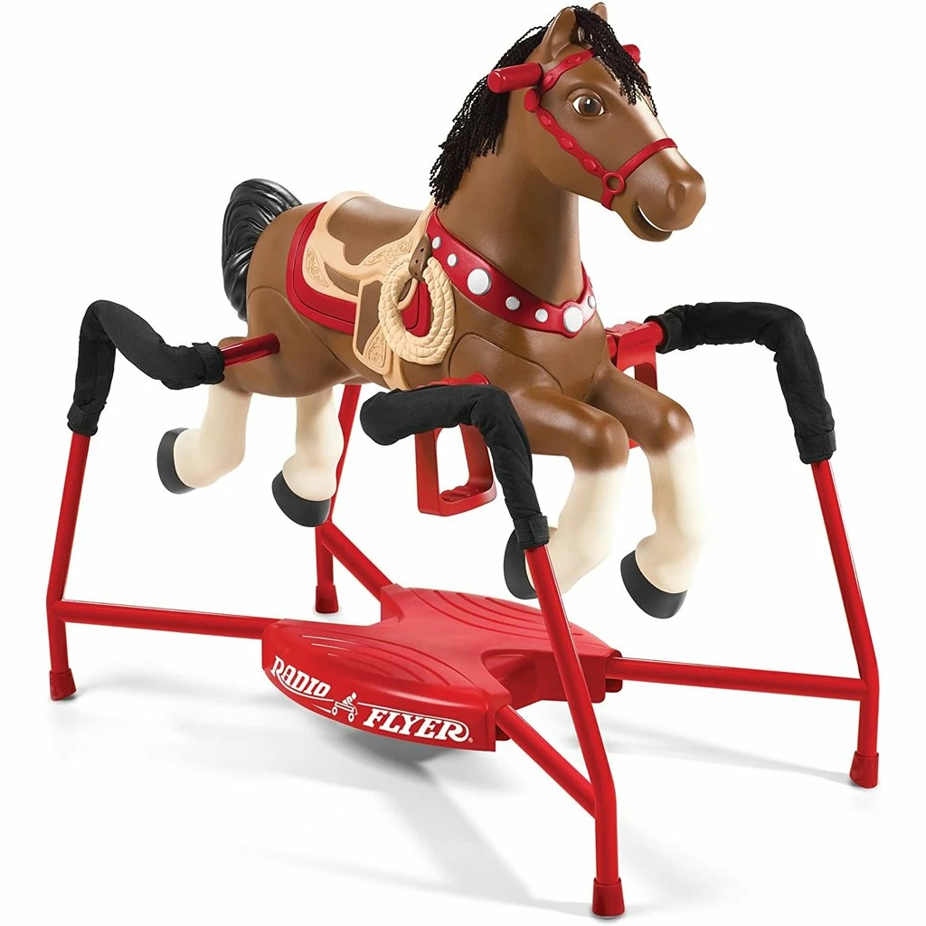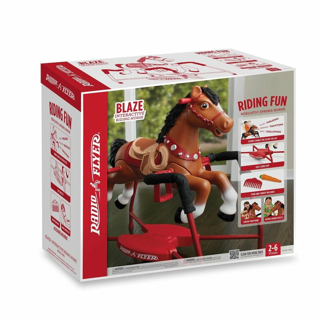 Meet Blaze: Interactive Spring Riding Horseβthe next best thing to a real horse! This beautiful, realistically designed spring horse responds to your childβs motion with life-like sounds triggered by three levels of riding action: walking, trotting and galloping. The spring horse also encourages imaginative play: the horse responds with eating sounds when “fed” the carrot accessory, and the soft yarn mane can be brushed with the comb accessory. For maximum safety, Blaze has built-in safety straps and an innovative βX” frame base with an EZ Climbβ’ step for easy on and off.Β
