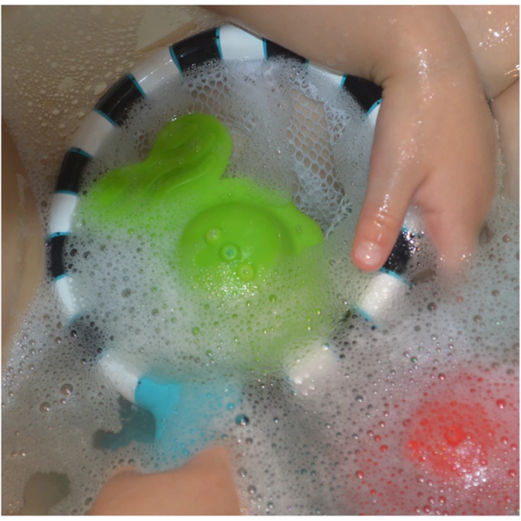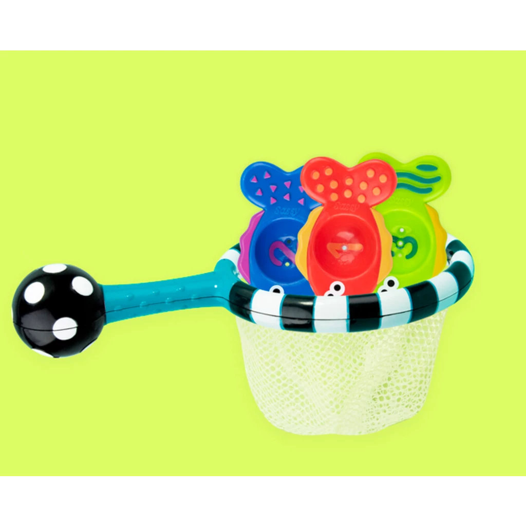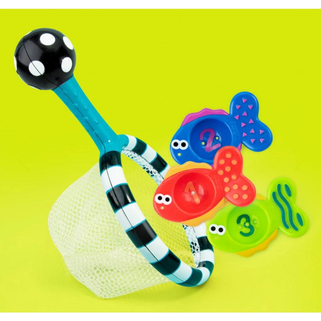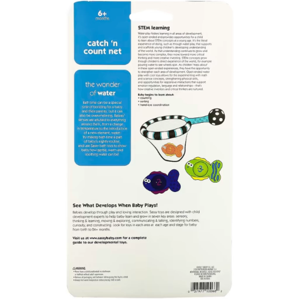 Sassy® Catch ‘N Count Net is a developmental learning toy that makes bath time fun! The three fish double as scoopers and strainers, and include numbers to learn counting. The easy-to-grasp net and fish are sized for baby’s hands and help to develop hand and eye coordination. Multiple textures engage baby’s sense of touch, and the bright contrasting colors aid baby’s visual development.