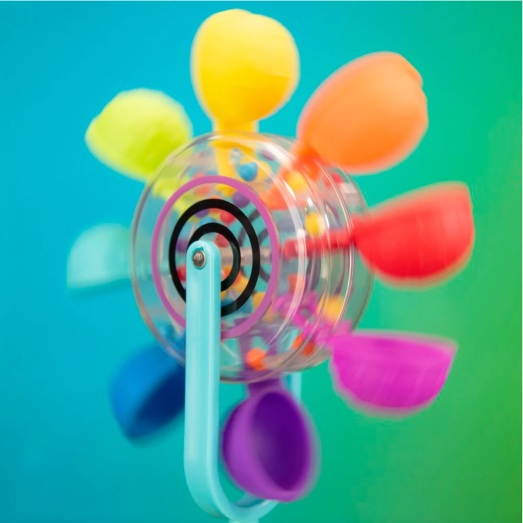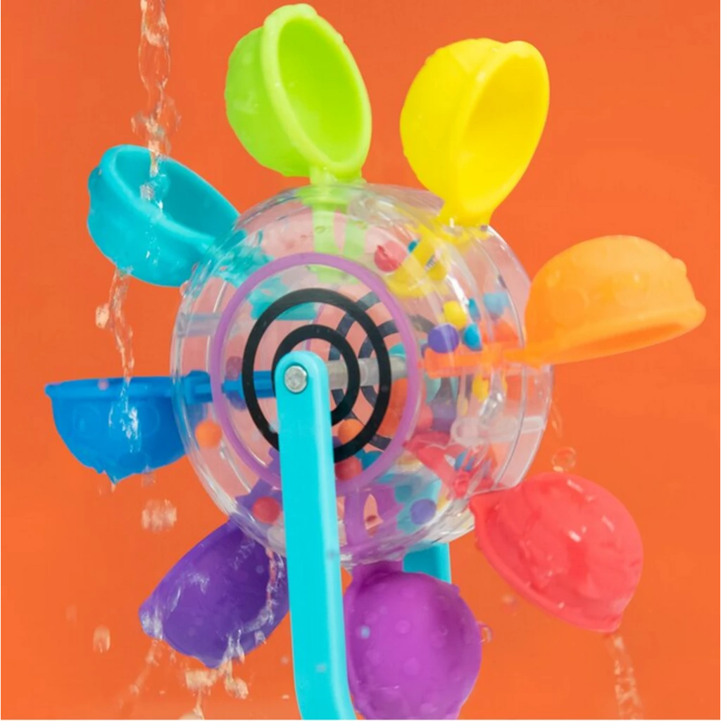- Spinning wheel encourages babyโs natural batting action. Soft colorful cups move as baby pours water over, teaching concepts of movement and re-action.