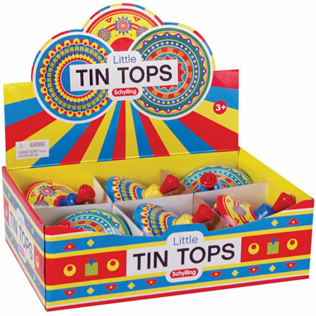 Our Little Tin Top is an old classic with a new twist. Just push the plunger down to make the top spin and stand upright. The colors, shapes, and designs blend together as the top spins. This colorful Little Tin Top is fun for everyone!