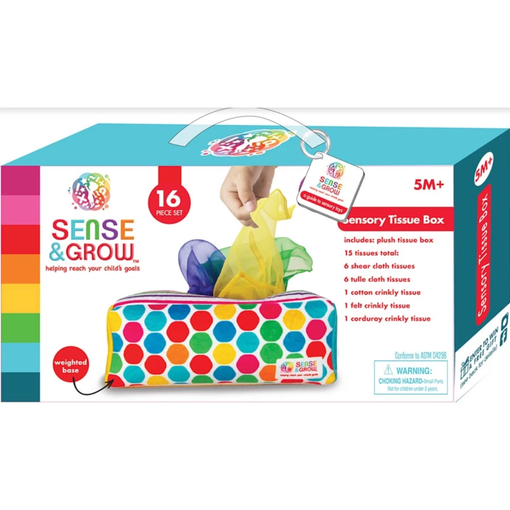 - Sensory Tissue Box is a 16-piece set that includes a plush tissue box with weighted base and 15 tissues total: