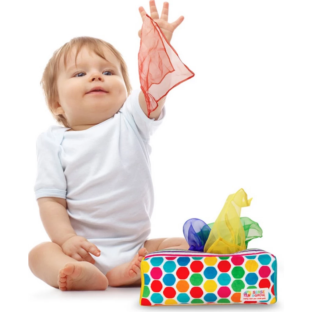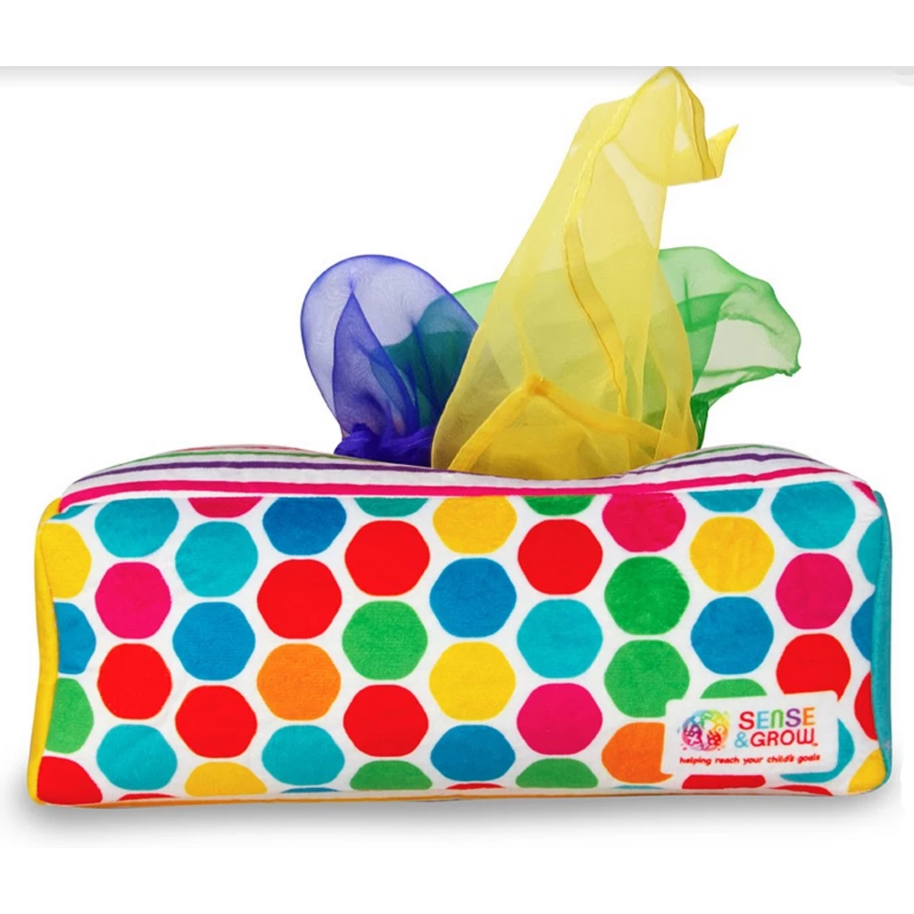 Here’s a fine alternative to the tissue boxes and paper that babies seem to love. Colorful, textured sensory scarves pull out of a plush, lightly weighted box β followed by another, and another! Babies develop fine motor and problem-solving skills and learn sorting and colors, all in a fun, exciting way. Safe and durable, this tissue box is here to stay!