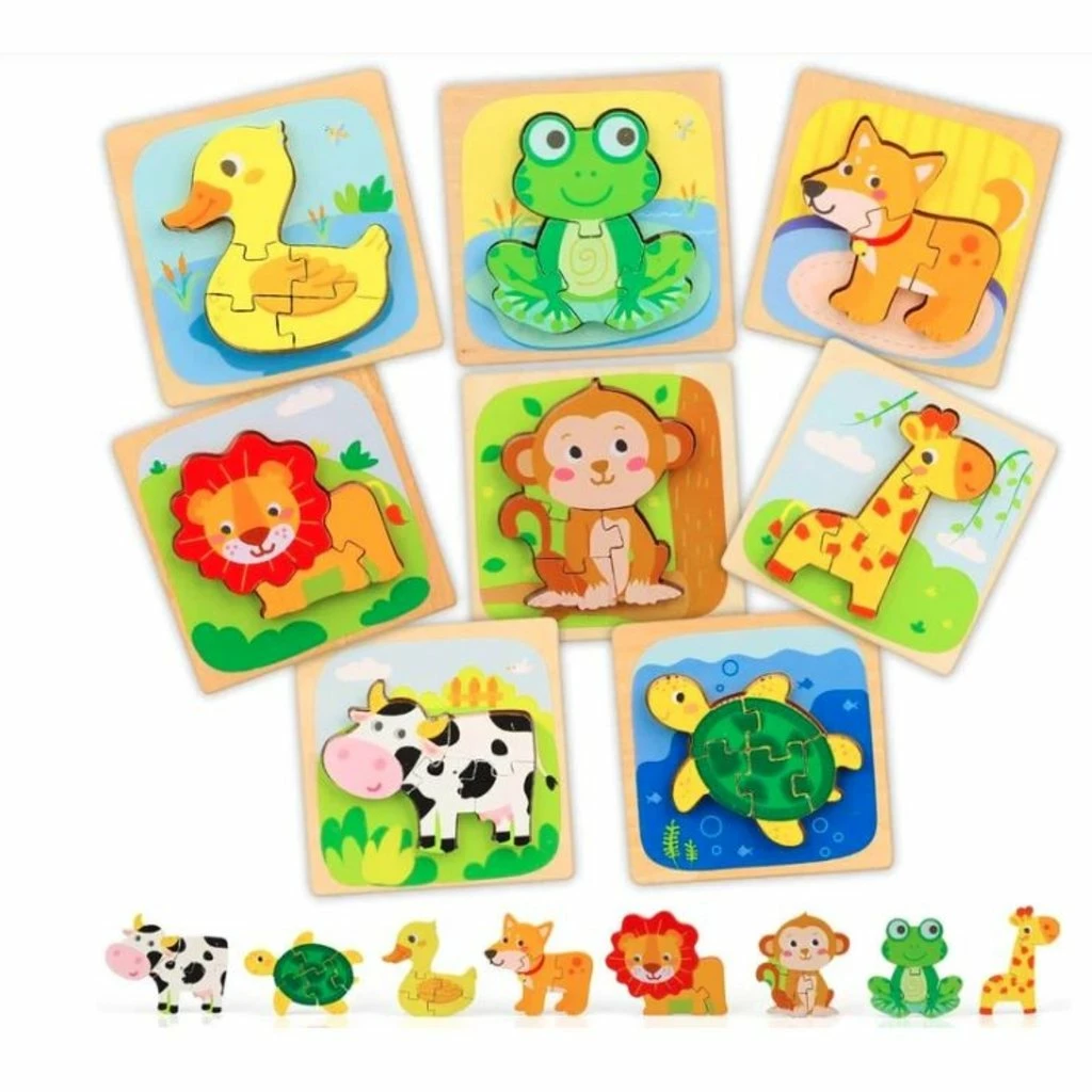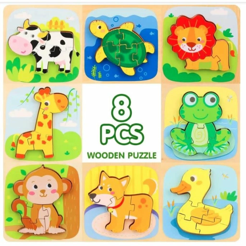 Our 8 Pack of Wooden Toddler Puzzles come with 8 different shapes with bright colors, including lion, turtle, cow, duck, dog, monkey, frog, and giraffe. The wooden pieces are thick and smooth, and each tray has a bottom pattern which helps kids better understand puzzle placement.
