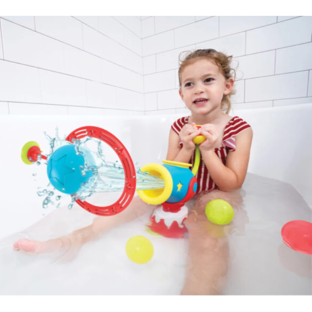 Bath time will be a blast as your child becomes a sharp-shooter in the tub! The Ball Blaster Water Cannon™ from Yookidoo® shoots 5 balls and water through a target hoop, teaching kids about cause and effect. The cannon is adjustable and it can be attached to the tub with suction cups. Also includes a handy storage basket that attaches to the tub.