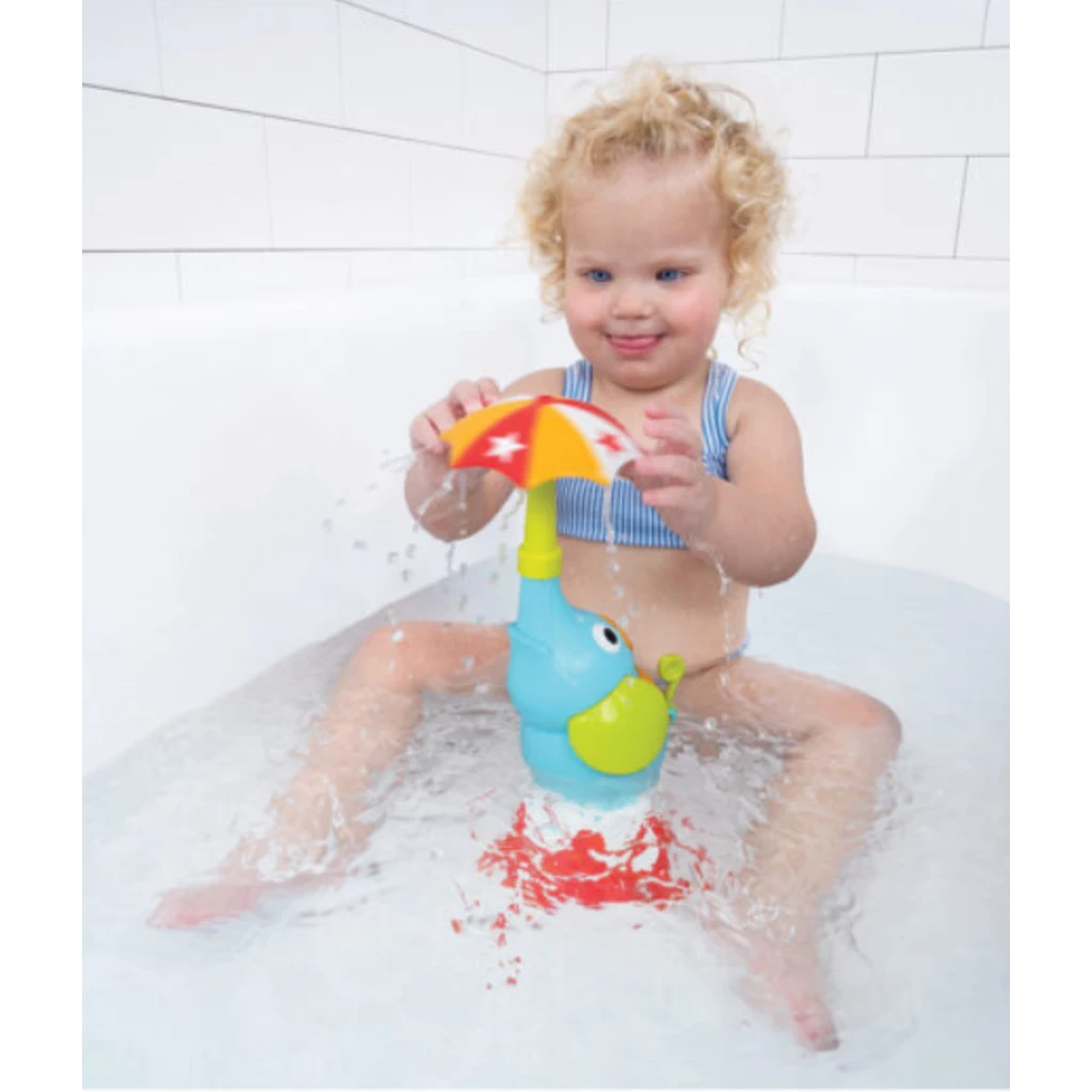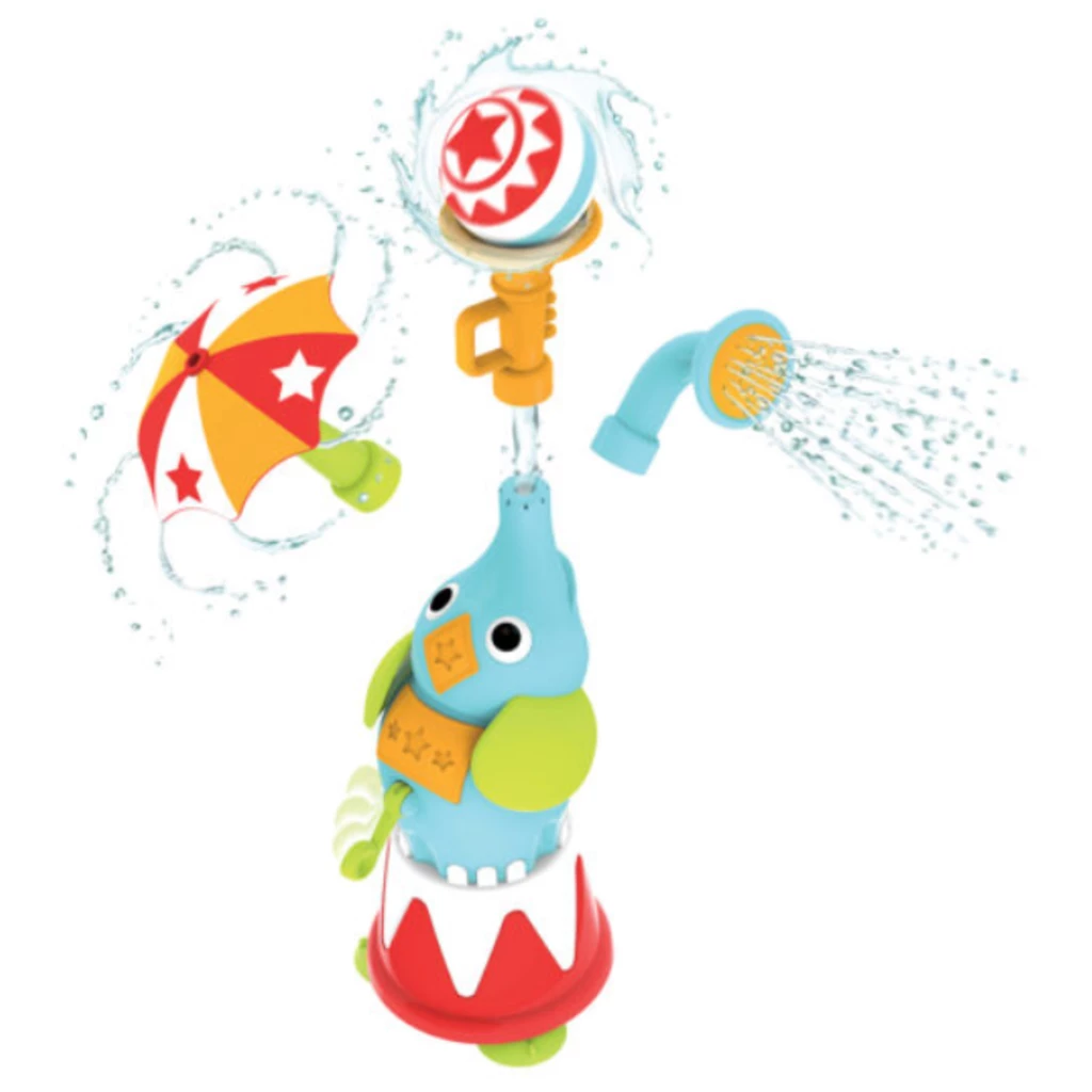 This battery-operated EleFountain Water Show from Yookidoo® has 4 accessories that create a different fun water effect. The trunk creates a shower, the spinning umbrella turns and sprays, and the trumpet releases 3 different water streams. Put the ball on top of the trumpet to watch it spin around! The fountain draws water directly from the tub, and a handy storage bag for the accessories is also included.